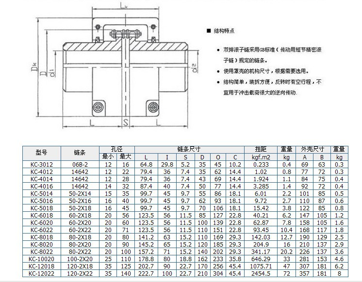 KC系列鏈條聯軸器 特點:是利用公用的鏈條,同時與兩個齒數相同的并列鏈輪嚙合,不同結構型式的鏈條聯軸器主要區別是采用不同的鏈條,常見的有雙排滾子鏈聯軸器、單排滾子鏈聯軸器、齒形鏈鏈條聯軸器、尼龍鏈聯軸器等。雙排滾子鏈聯軸器性能優于其他結構型式的聯軸器,為國內外廣泛采用,我過亦已定制訂位***標準。